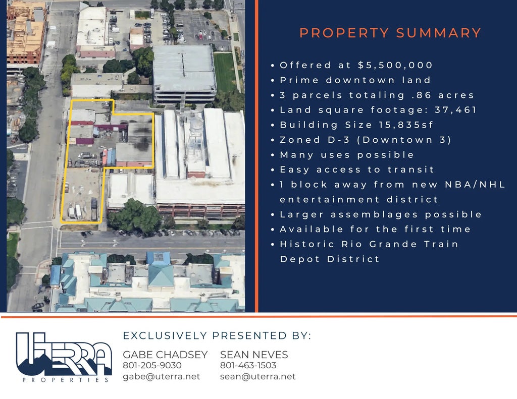 Extremely rare opportunity to own almost an acre of prime downtown SLC land. Approx. 16,000sf of existing buildings. Offering includes parcels 15-01-179-011 and 15-01-179-005. 3 parcels totaling .86 Acres. Zoned D-3 with many possible uses. Across from the Historic Rio Grande Train Depot District and 1 block from the new NBA/NHL Entertainment District.