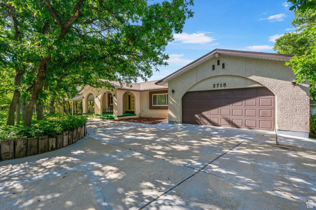 Beautiful East Side Layton property with nearly an acre of land! This 5 bedroom rambler with a den has 2 kitchens, 2 laundry areas, 2 fireplaces and is ready for your updates! Open kitchen and family room floorpan with a sun room off of the family room.Walk out basement can be used as an ADU rental. There is a carport for extra parking and a fully fenced yard around the home! Lower level of the lot can be accesses through a staircase or by car through an easement. The lower half of the property includes a Large 624 square foot detached garage with bathroom, heat, power and workshop! Separate shed is over 500 square feet with power! Tons of Storage! Walk down the full landscaped lowest level of the property and enjoy sitting by the creek in the shade for a picnic or evening fire pit! Plenty of room for gardening, enjoyment and entertaining! Come see this amazing property today! Square footage figures are provided as a courtesy estimate only and were obtained from Tax data. Shed and garage measured by owner. Buyer is advised to obtain an independent measurement.