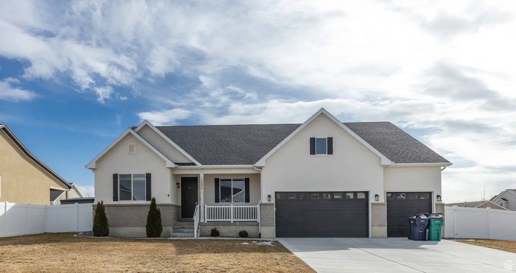 Step into this beautifully maintained one-owner custom rambler, offering nearly 4,000 square feet of thoughtfully designed living space on a .28-acre lot. With 5 spacious bedrooms, 3.5 bathrooms, and a 3-car garage featuring an epoxy-coated floor, this home combines elegance with everyday function. Soaring 9-foot ceilings on both levels of the home create an open, airy feel throughout. The gourmet kitchen is a chef's dream, featuring quartz countertops, GE Caf appliances including a convection/microwave combo double oven, and a reverse osmosis water purification system. The inviting great room centers around a sleek Frame TV mounted above a timber mantel and modern linear fireplace-perfect for entertaining or relaxing in style. The luxurious master suite includes dual closets (one walk-in), a spa-like bath with a jetted tub, separate Euro-glass shower, and double sinks. Additional highlights include a main-level office with French doors, top-down/bottom-up blinds, main-level laundry, and a fully finished walk-out basement with 9-foot ceilings, large family room, and generously sized bedrooms with walk-in closets. Enjoy energy-efficient upgrades and amenities like a tankless water heater, smart thermostat, and water softener. Outside, the fully fenced yard features a large patio and Wi-Fi controlled automatic sprinklers-ideal for easy outdoor living.